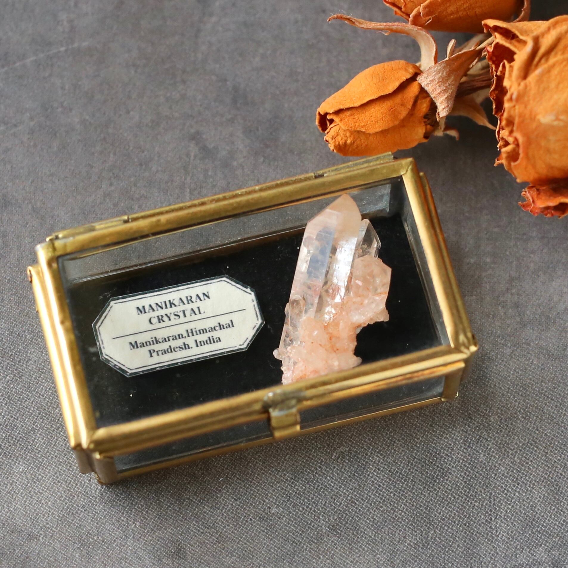 アンティークなガラスケースに、小さな小さな天然石の結晶を閉じ込めたオリジナルの鉱物標本です
