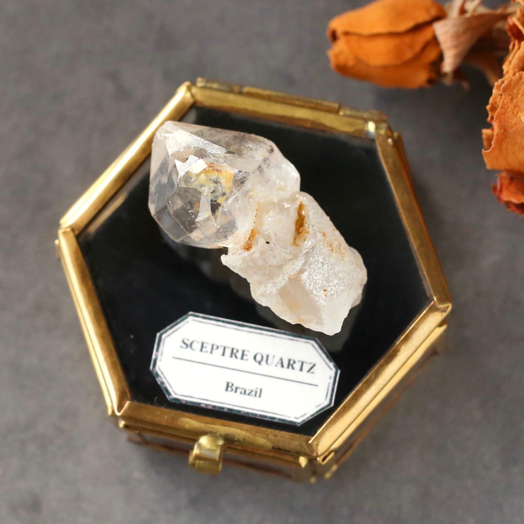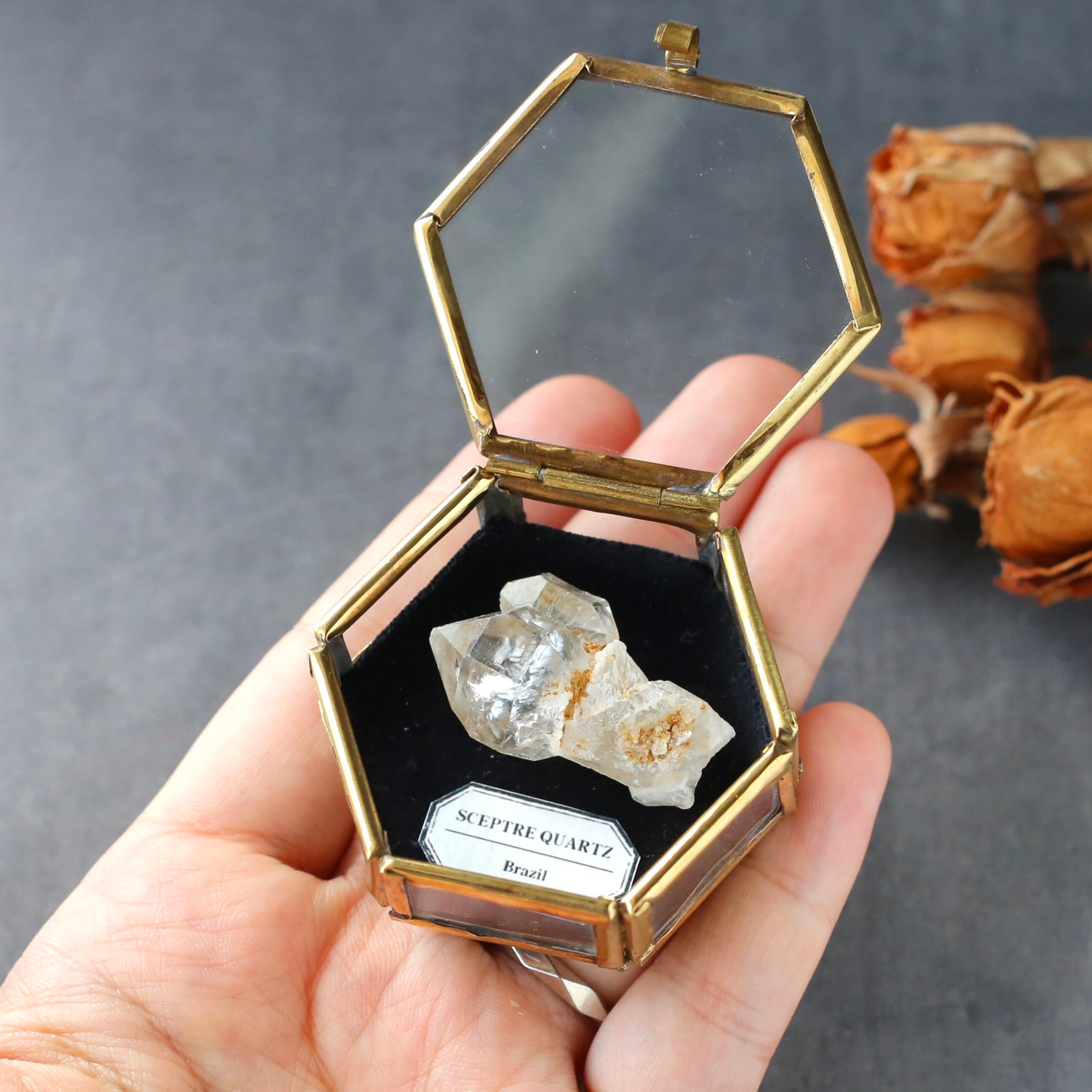 アンティークなガラスケースに、小さな小さな天然石の結晶を閉じ込めたオリジナルの鉱物標本です