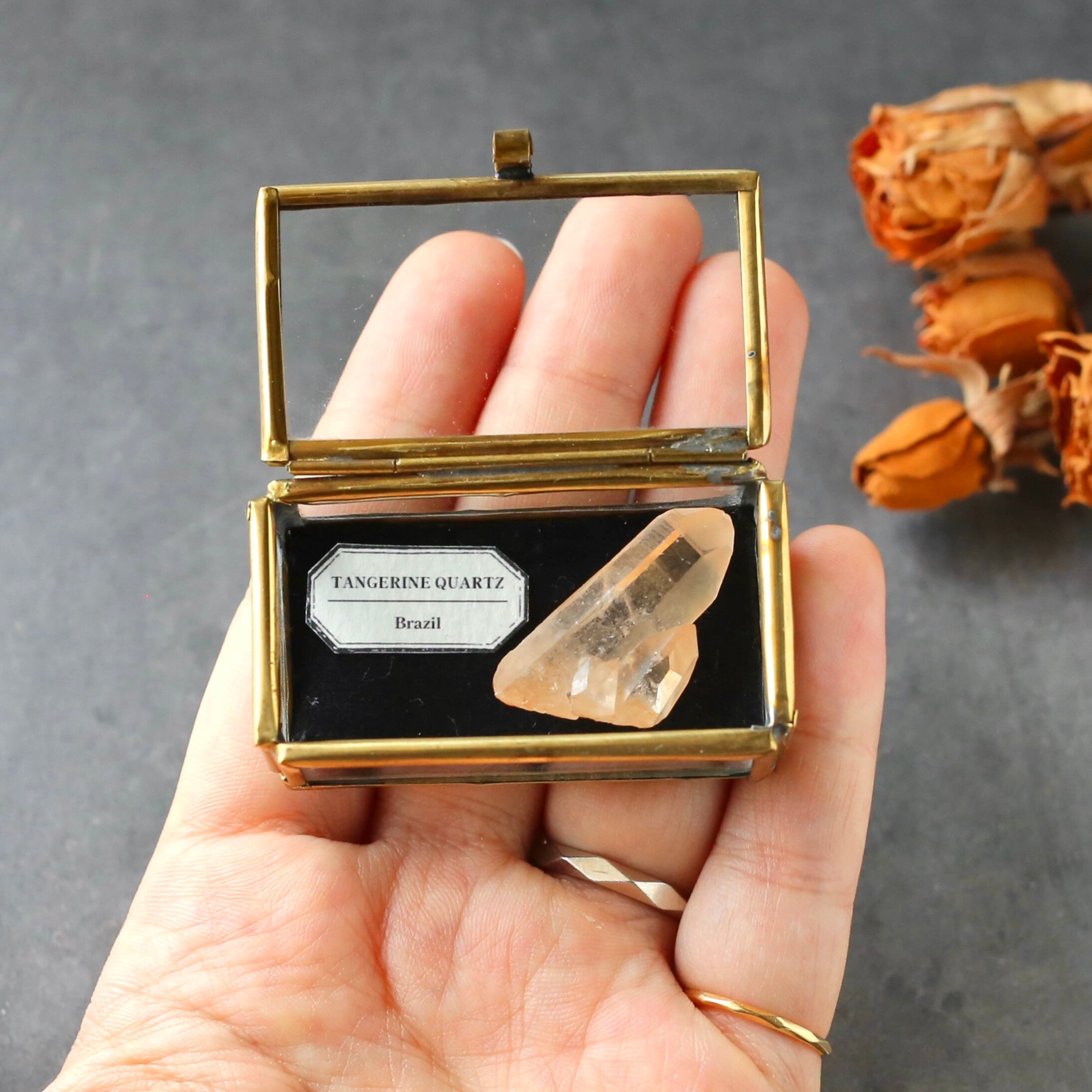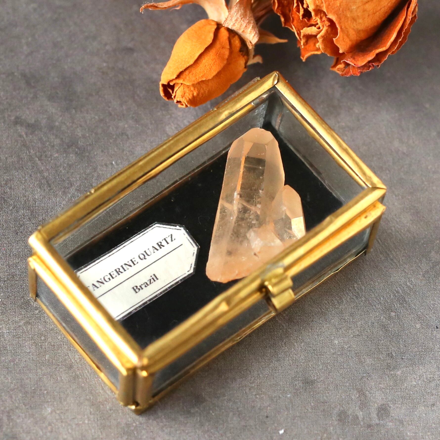 アンティーク調のガラスケースに、小さな小さな天然石の結晶を閉じ込めたオリジナルの鉱物標本です