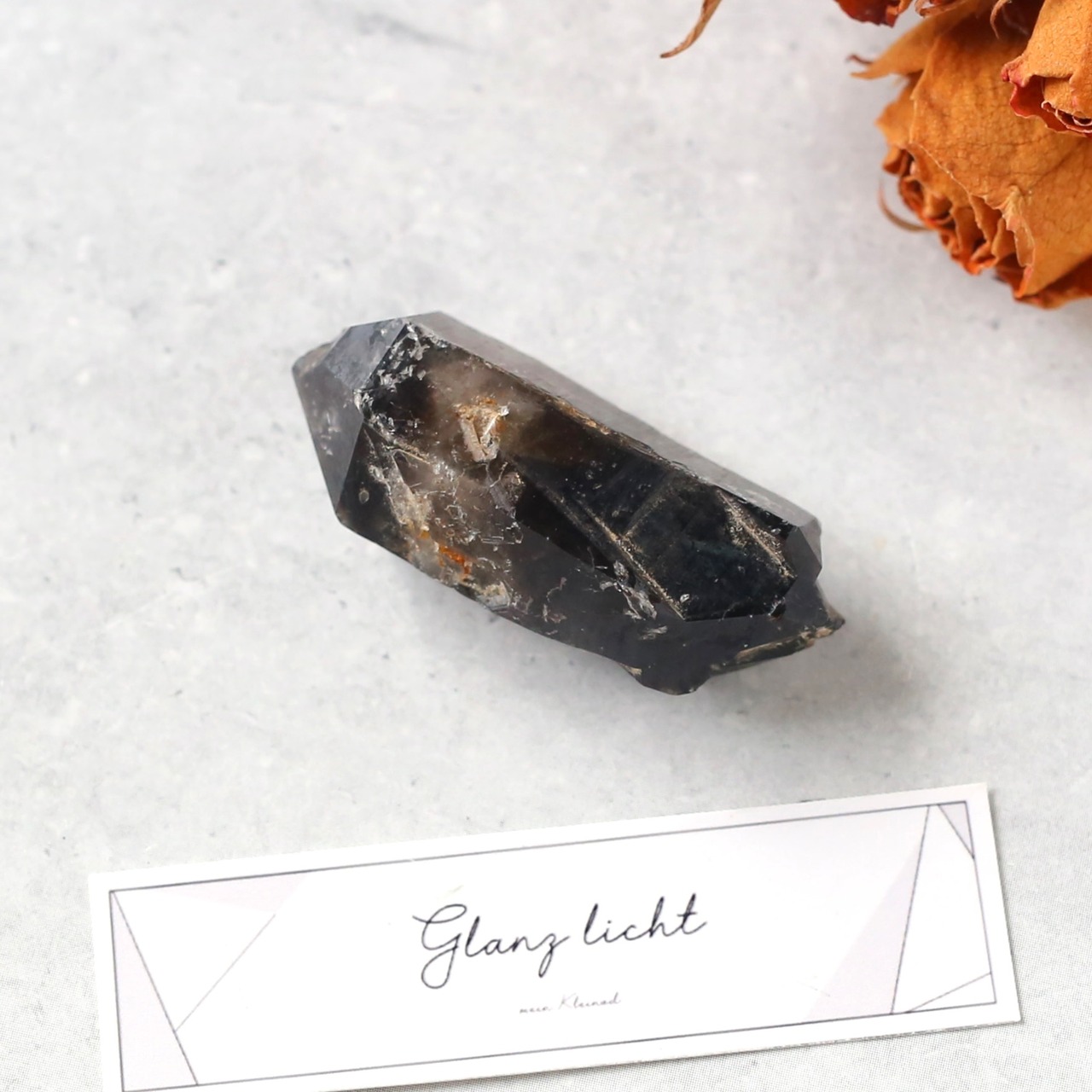 茶水晶・煙水晶とも呼ばれ、アルミニウムを微量に含んだ水晶が、自然の放射線の影響で変色したもので、光が透き通らないものはモリオン(黒水晶)となります