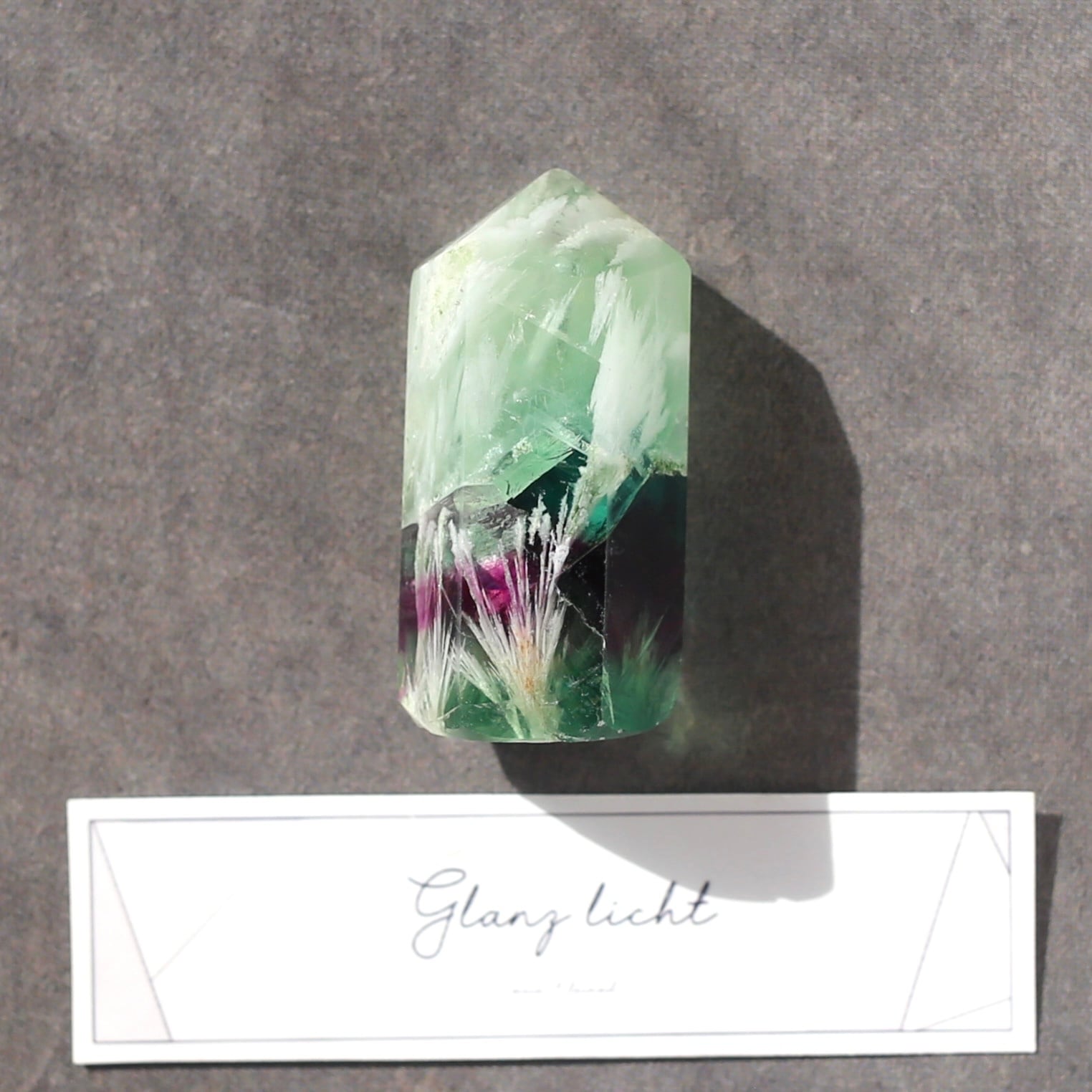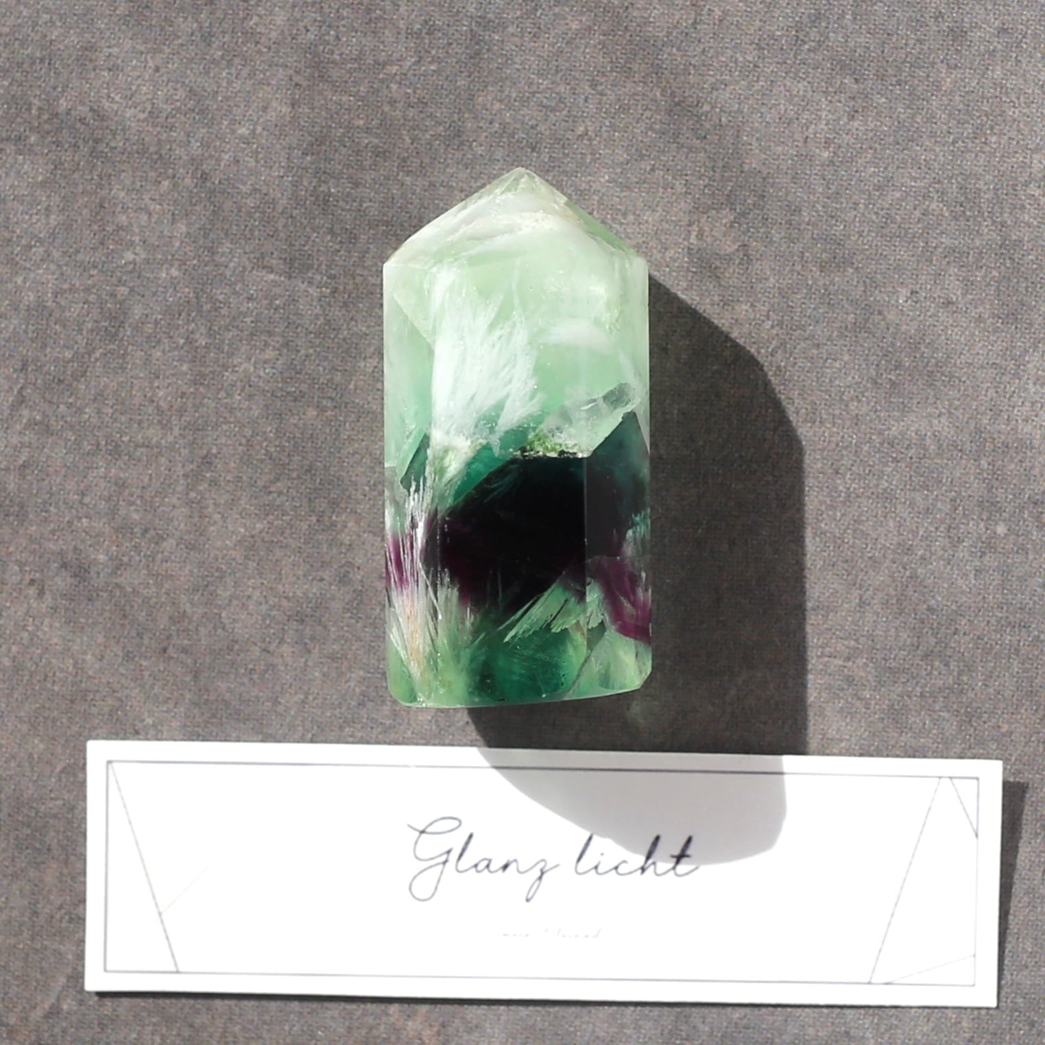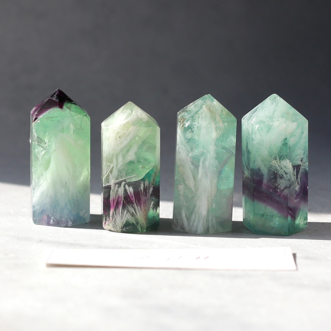 透明感のあるグリーンや濃いパープルの色の中に、白いフェザーがとても映える綺麗なエンジェルフェザーフローライトです