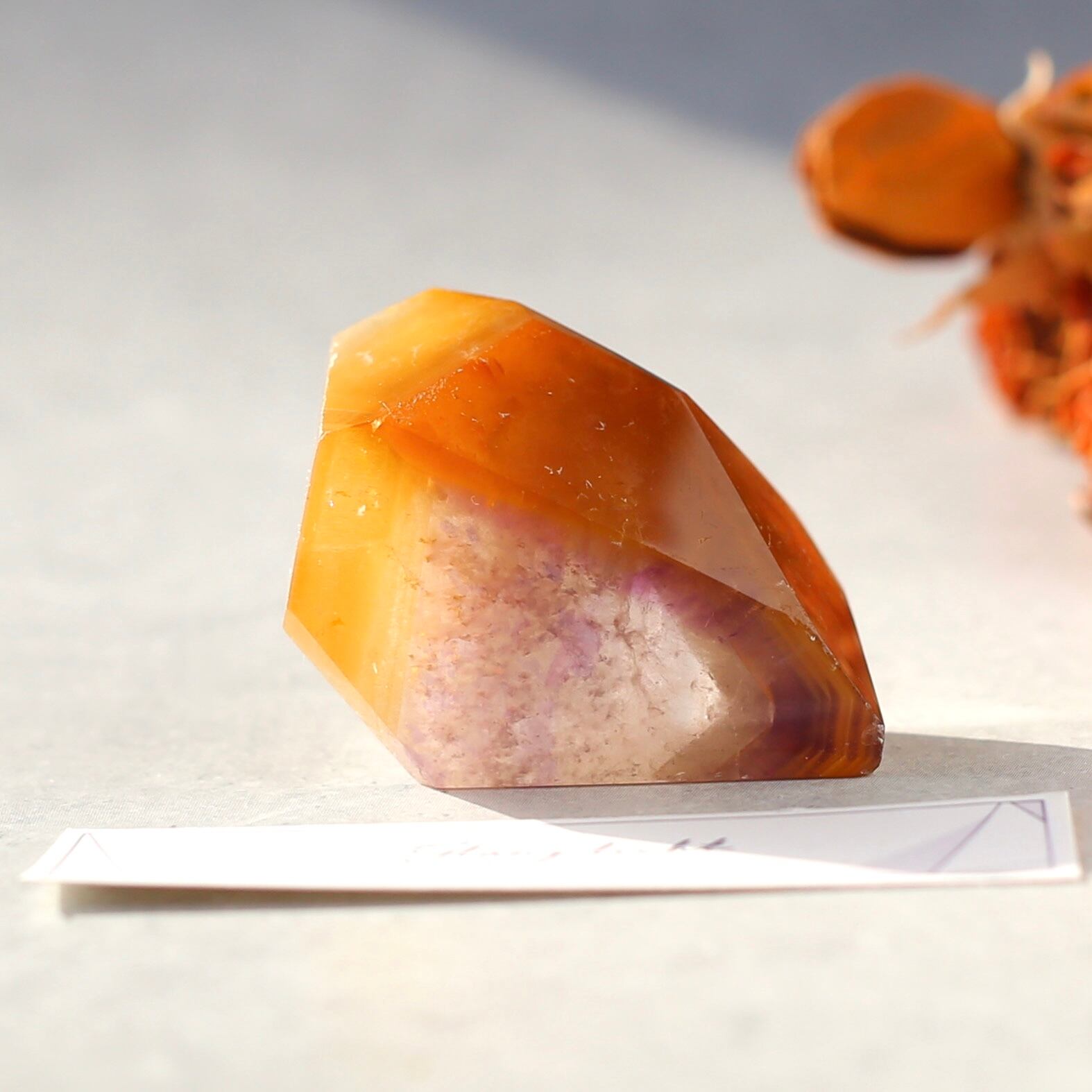 原石をポリッシュ(磨き)することによって、クラックが入った透明なレムリアンシードと層になって覆っている外側のアメジストの様子のどちらも楽しむことができるようになっています!