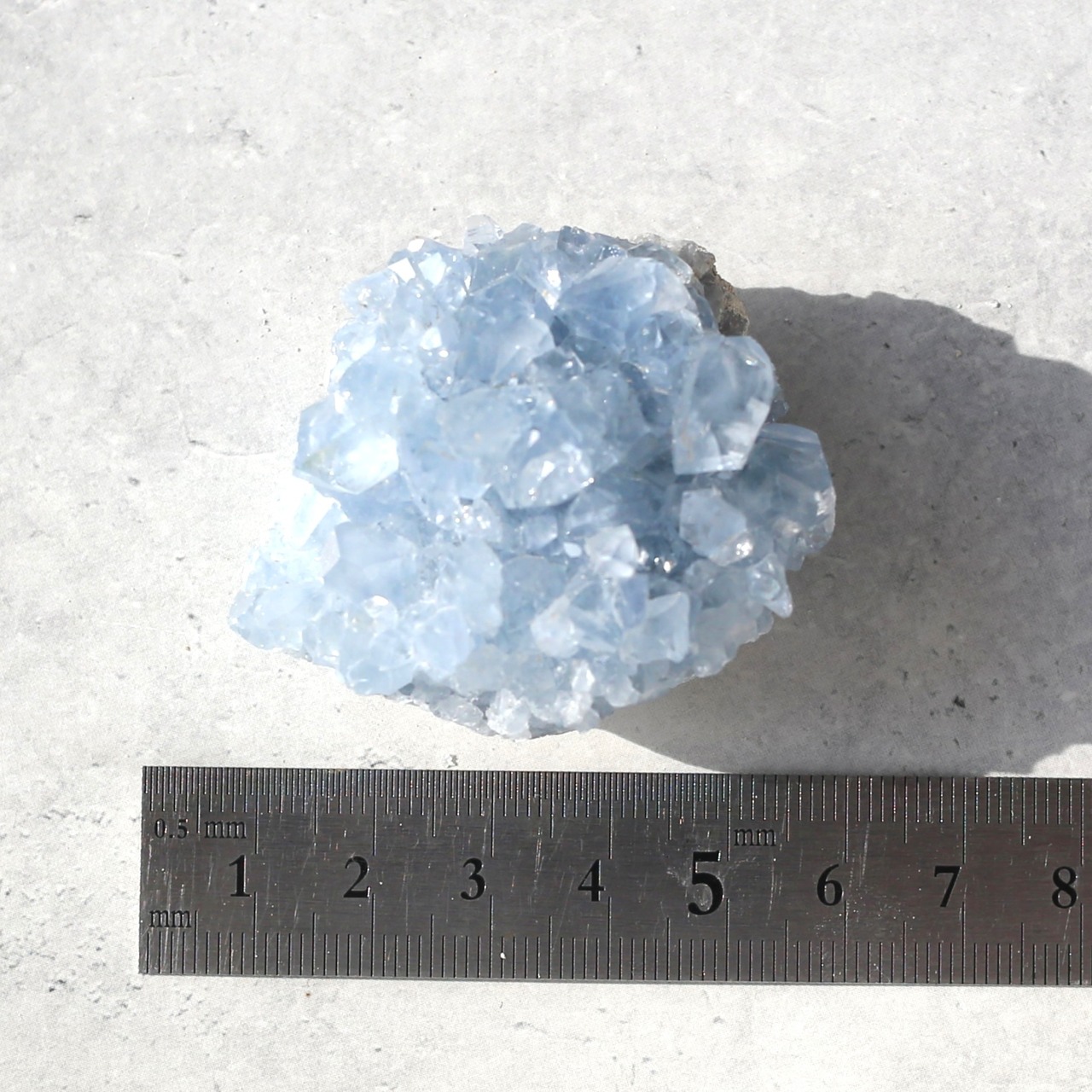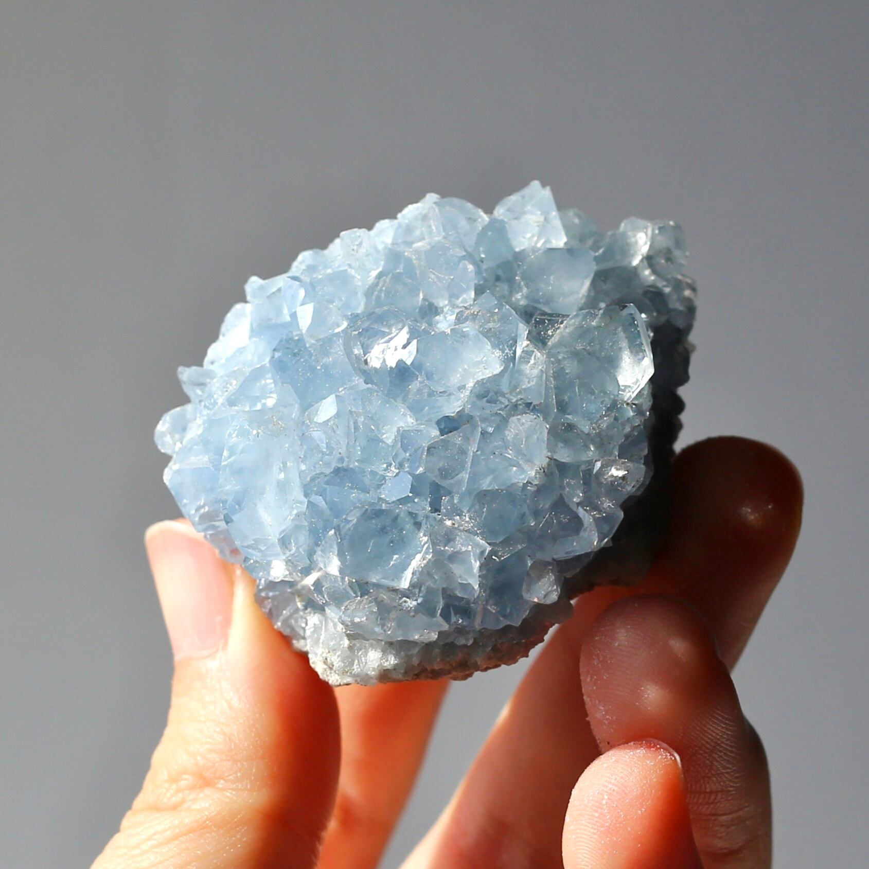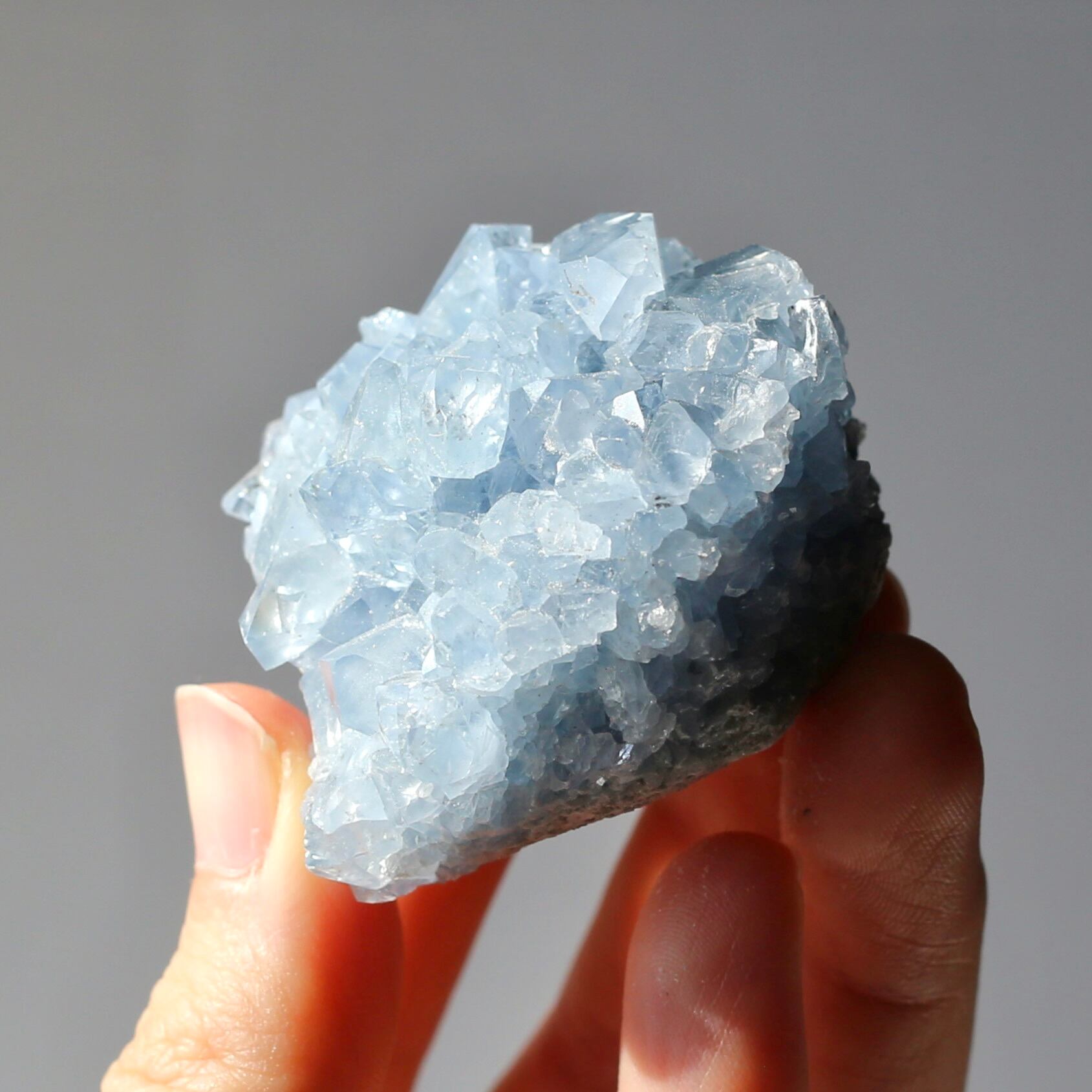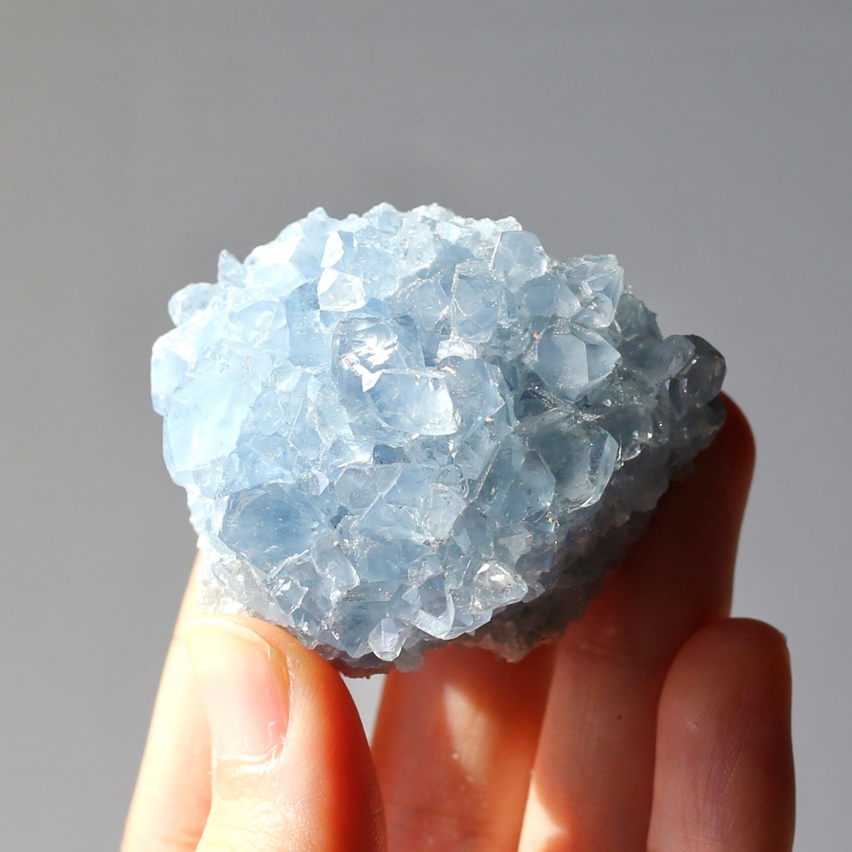 淡いブルーとたくさん乗ったキラキラの結晶が綺麗なセレスタイトクラスターです