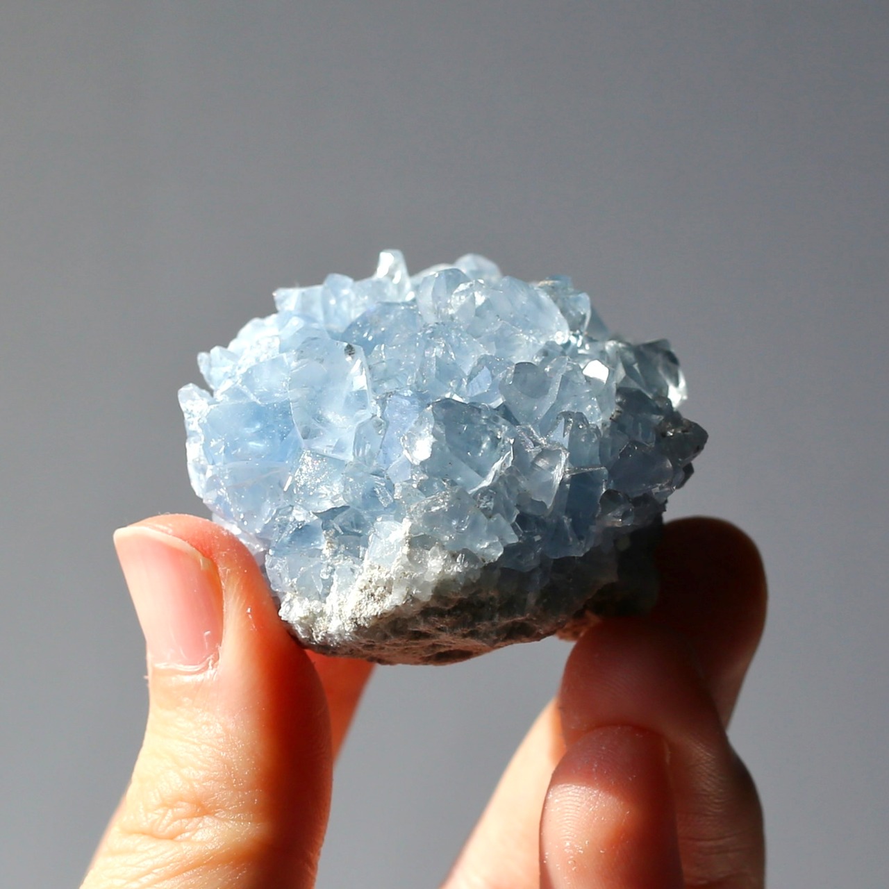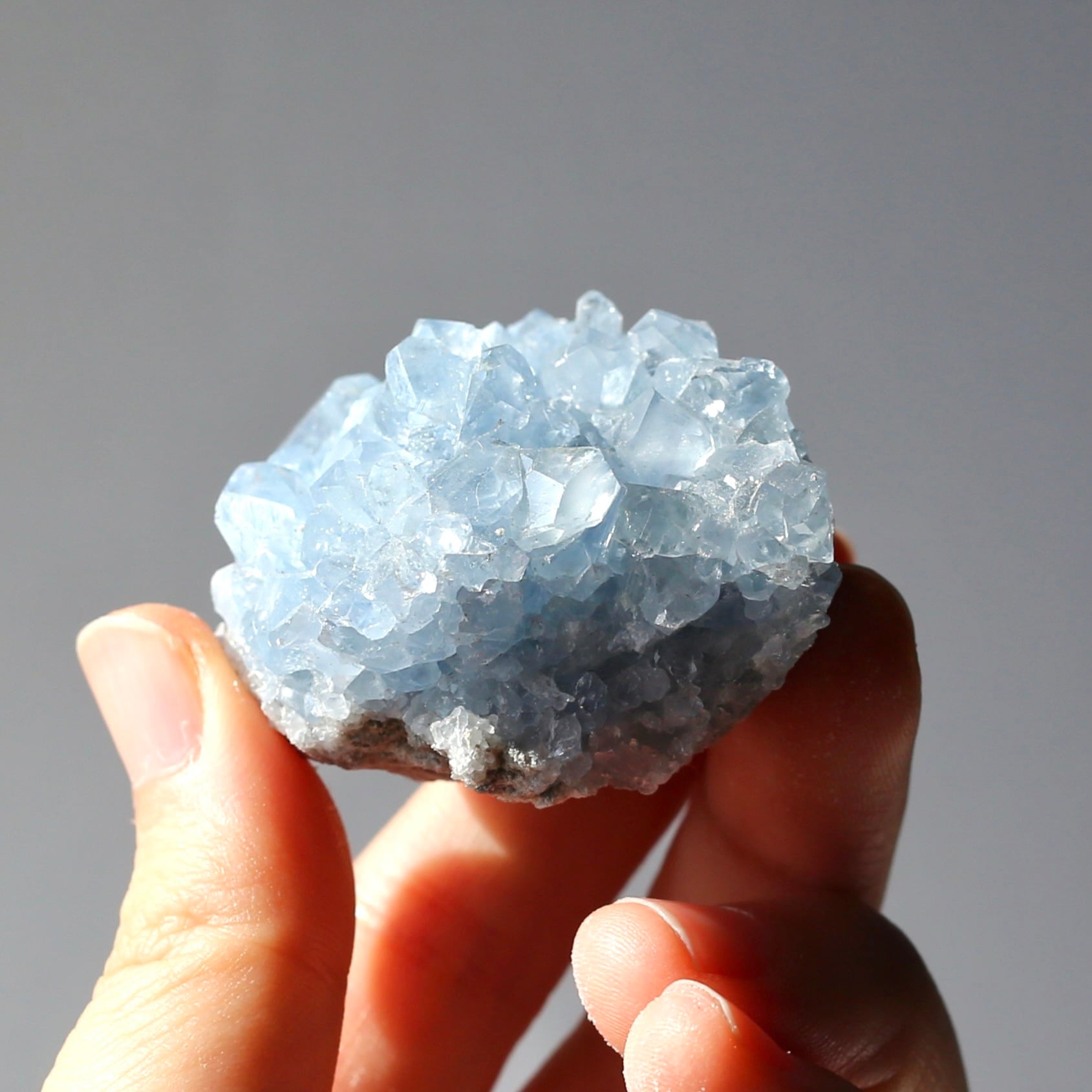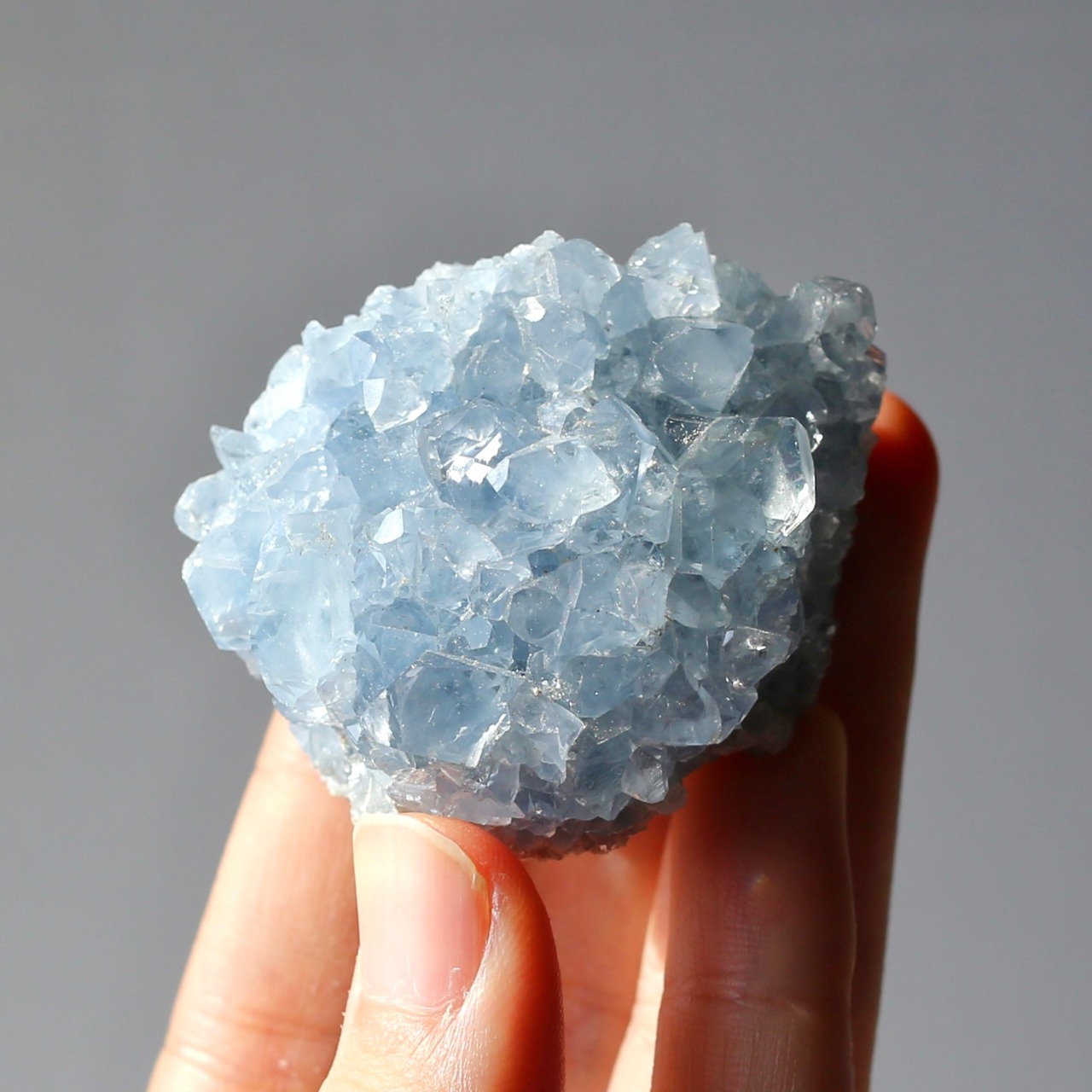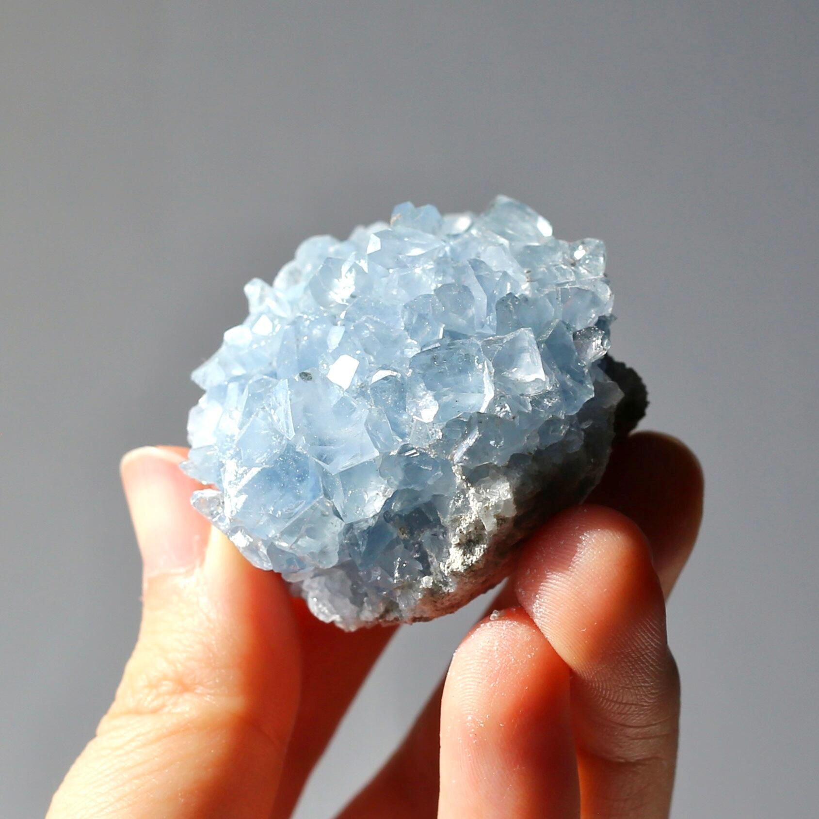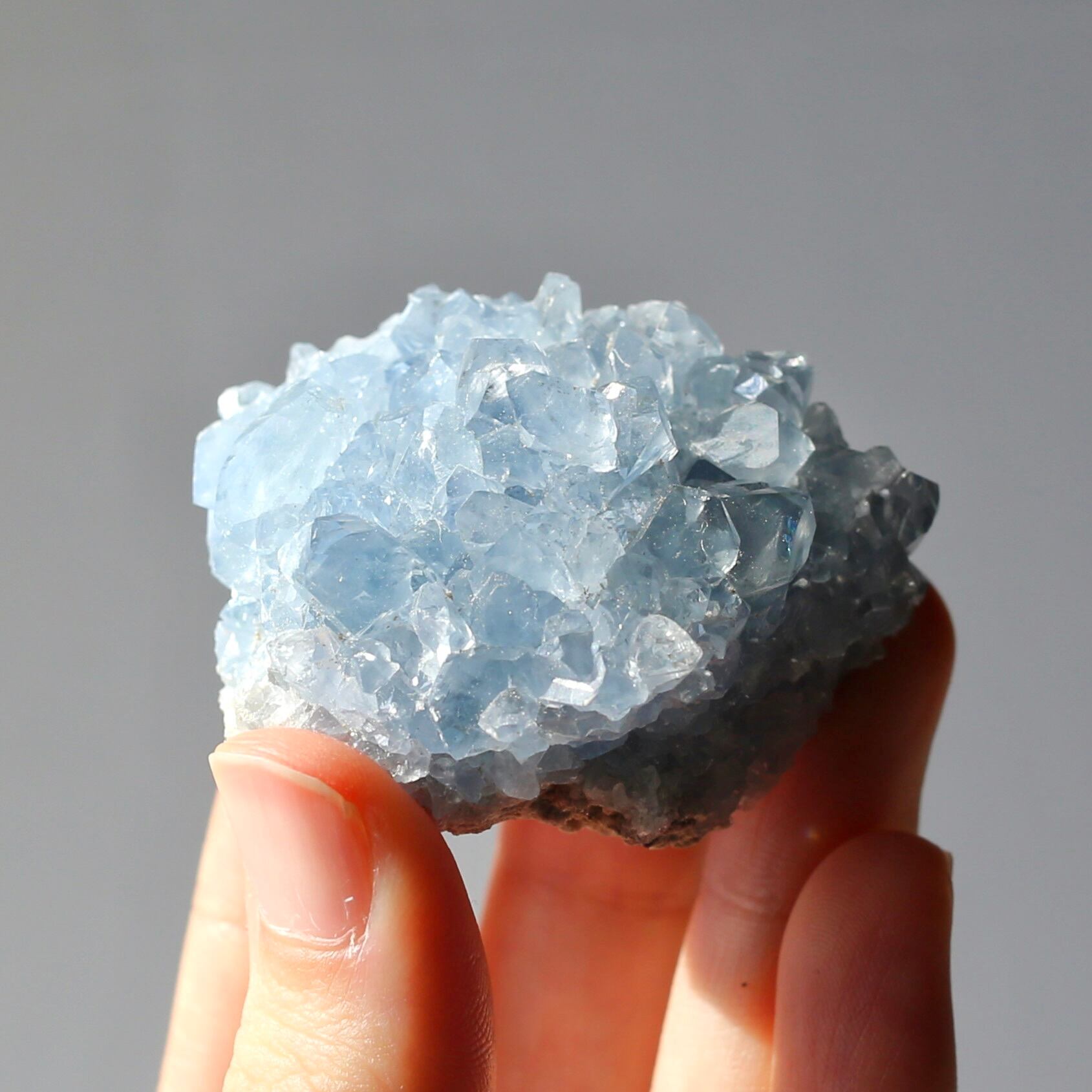 淡いブルーとたくさん乗ったキラキラの結晶が綺麗なセレスタイトクラスターです