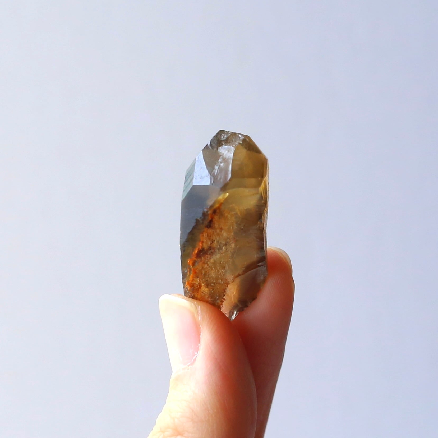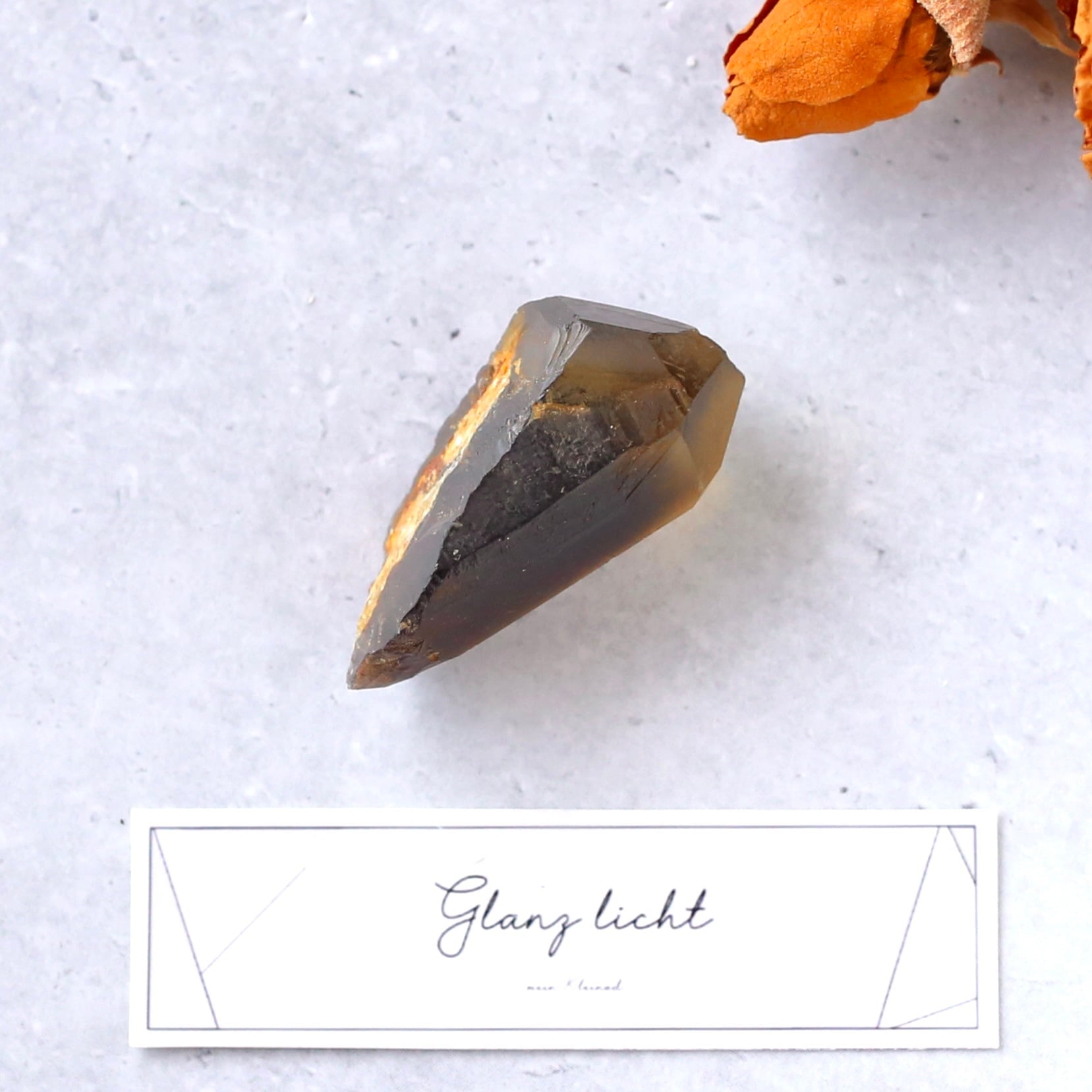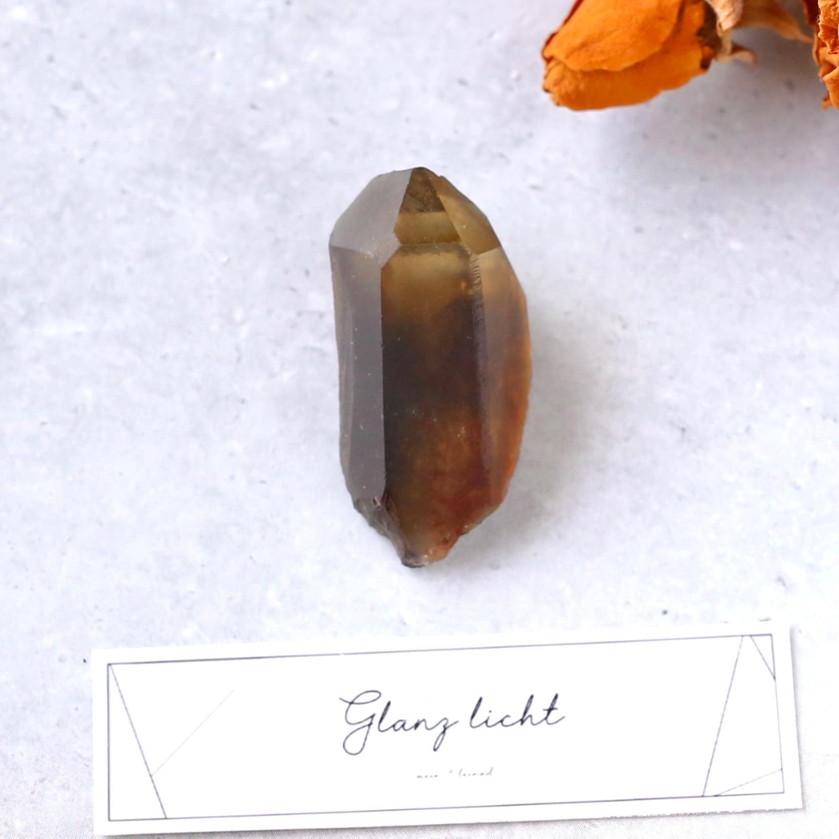 水晶の透明感が残りながらも、水の中に溶けだしたようなブラウンが美しい結晶です