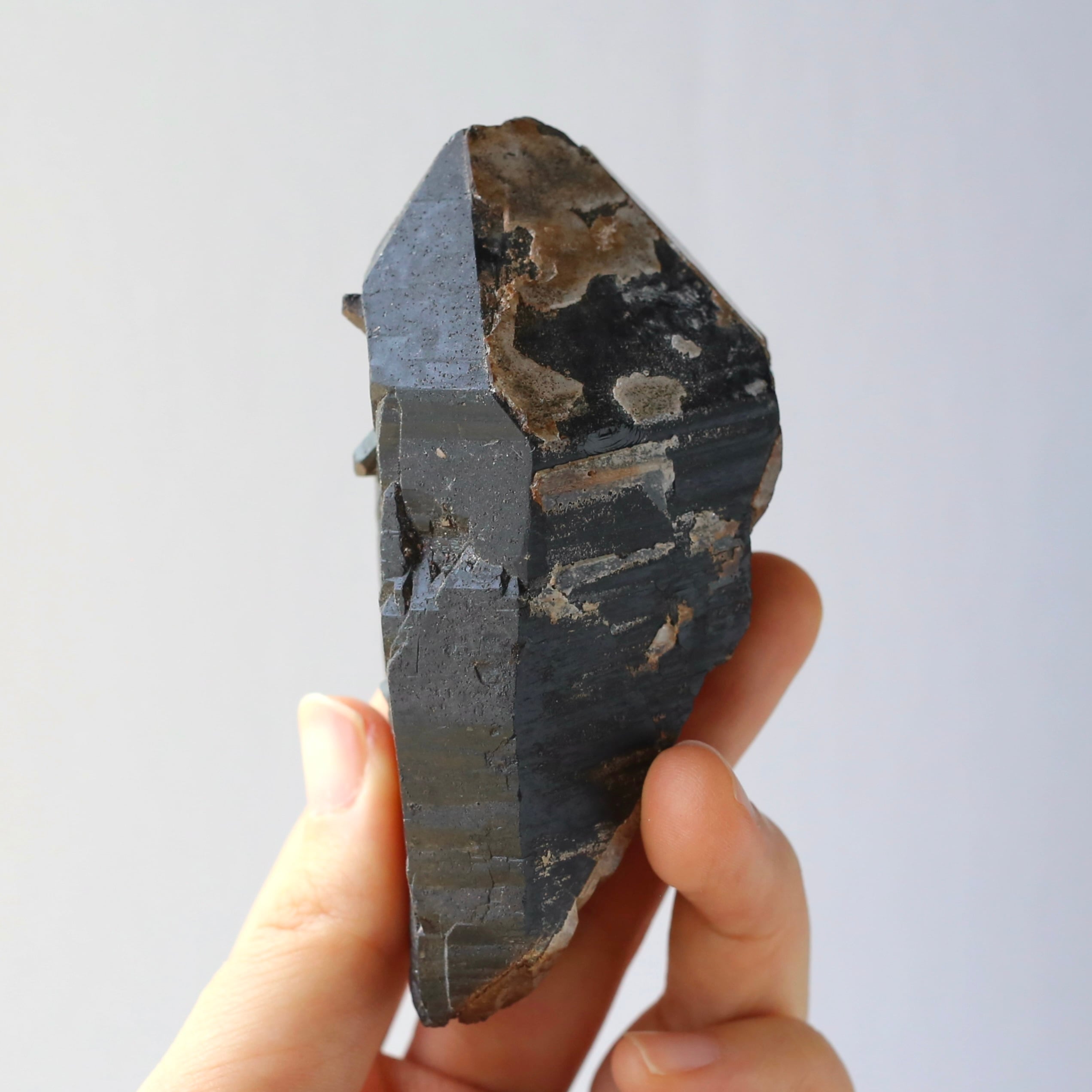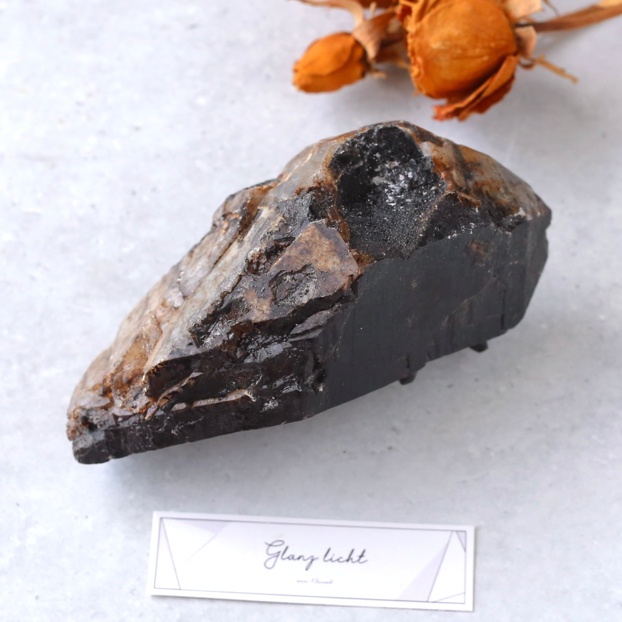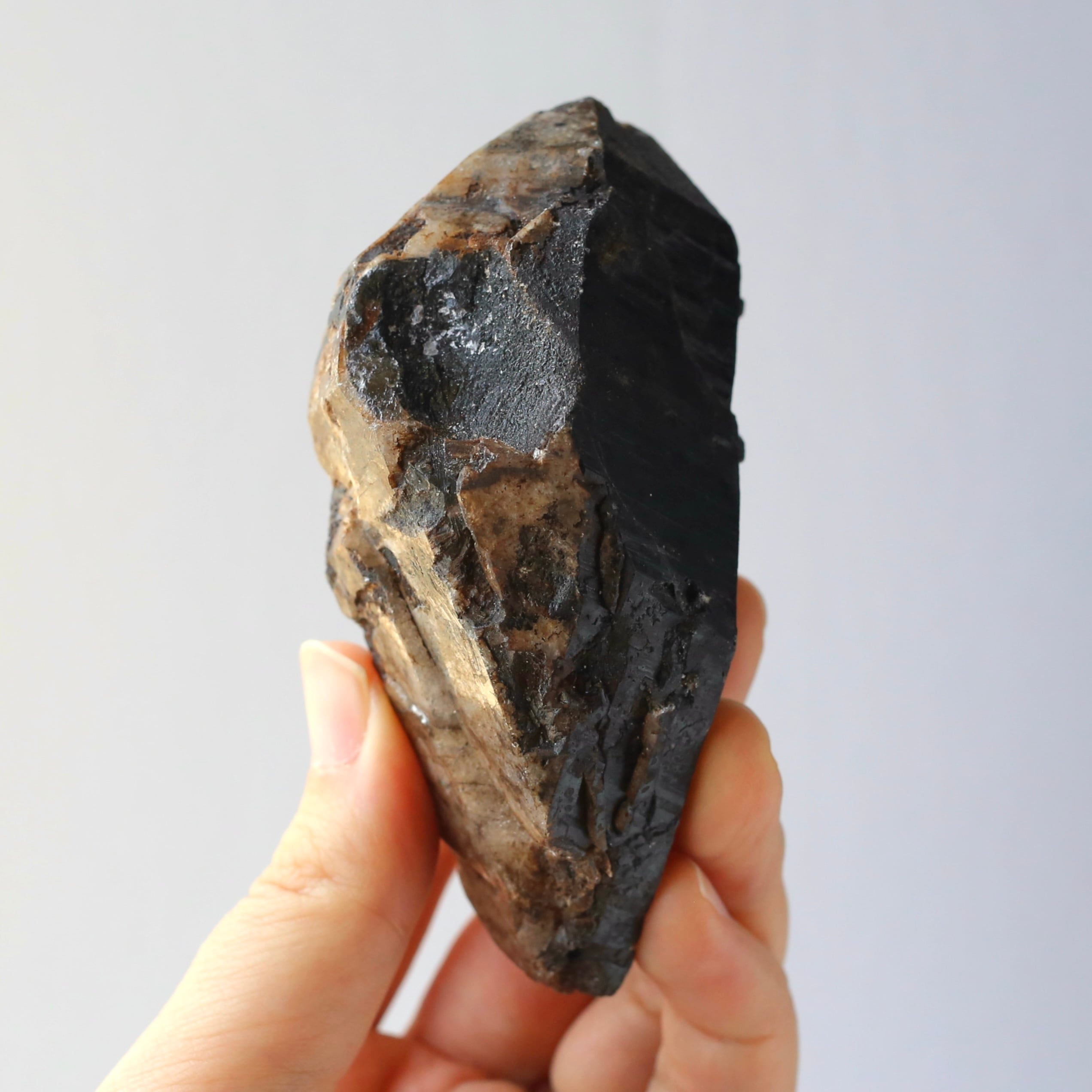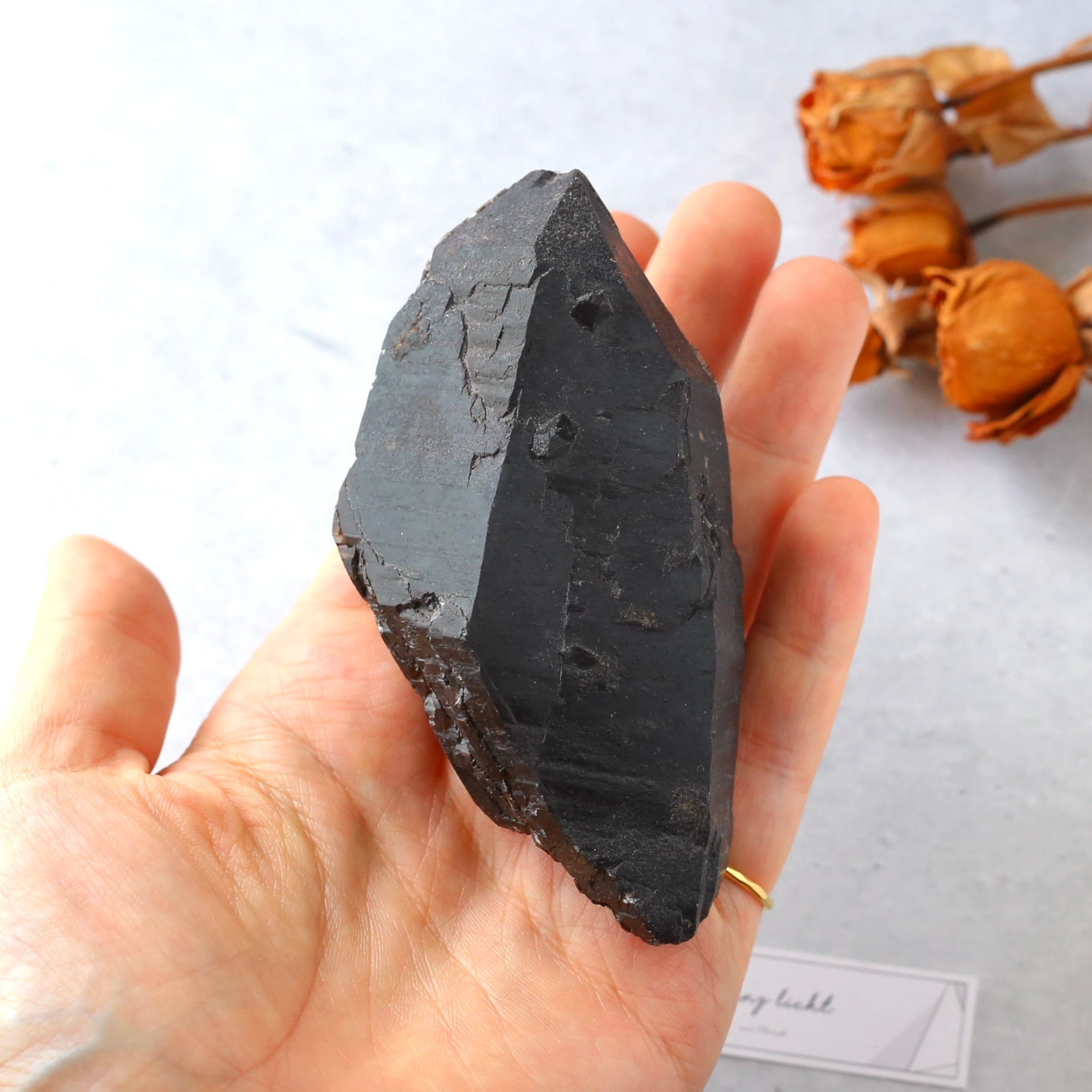 しっかりとした大きさで、色合いもしっかり濃い漆黒のモリオンの原石です