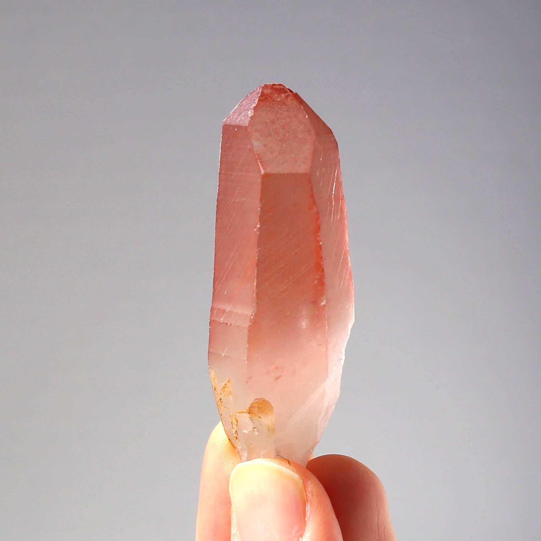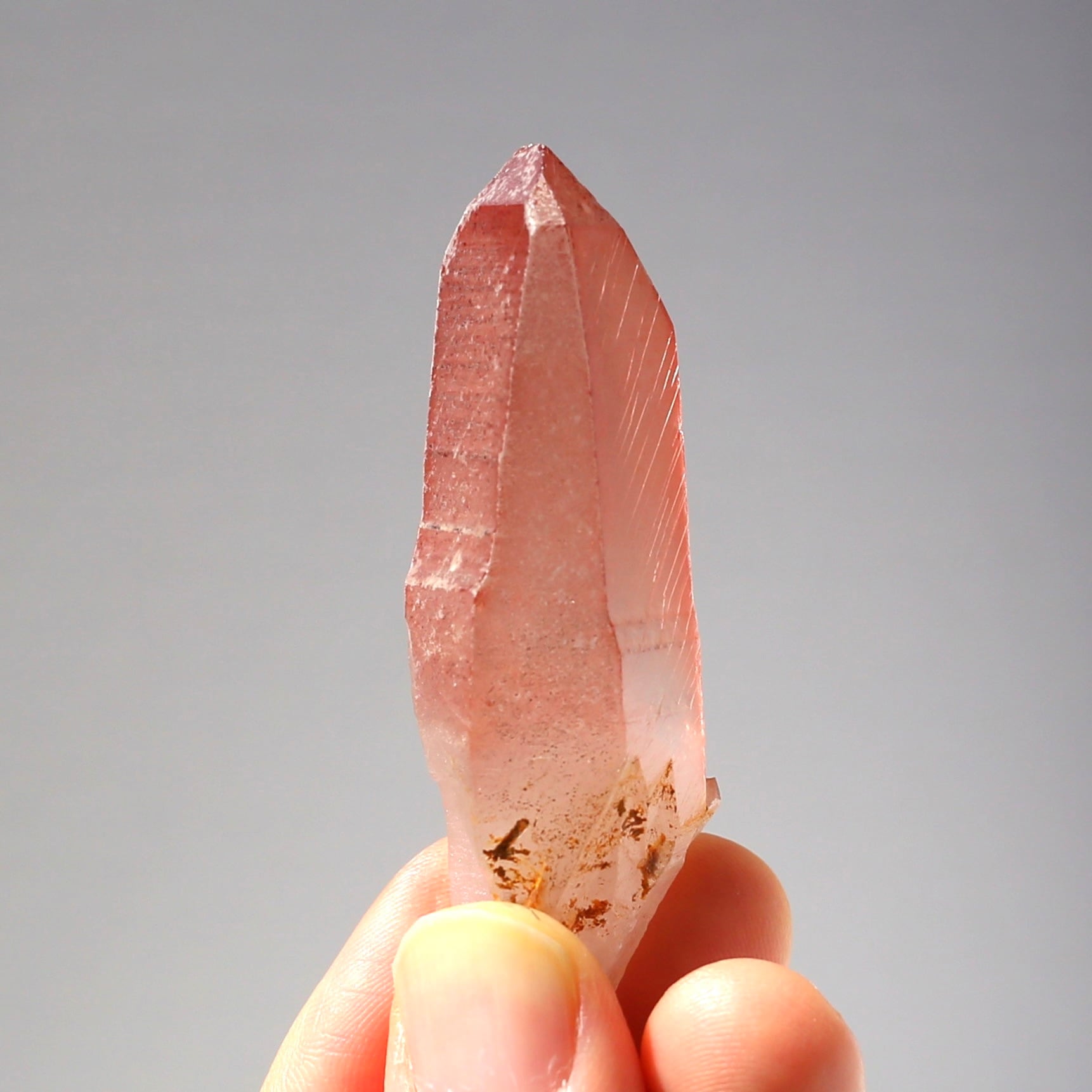 表面が柔らかなすりガラス状のフロストになっており、ツヤツヤとした透明感はないですが、ふんわりと優しい包み込むような美しさを持っている結晶です