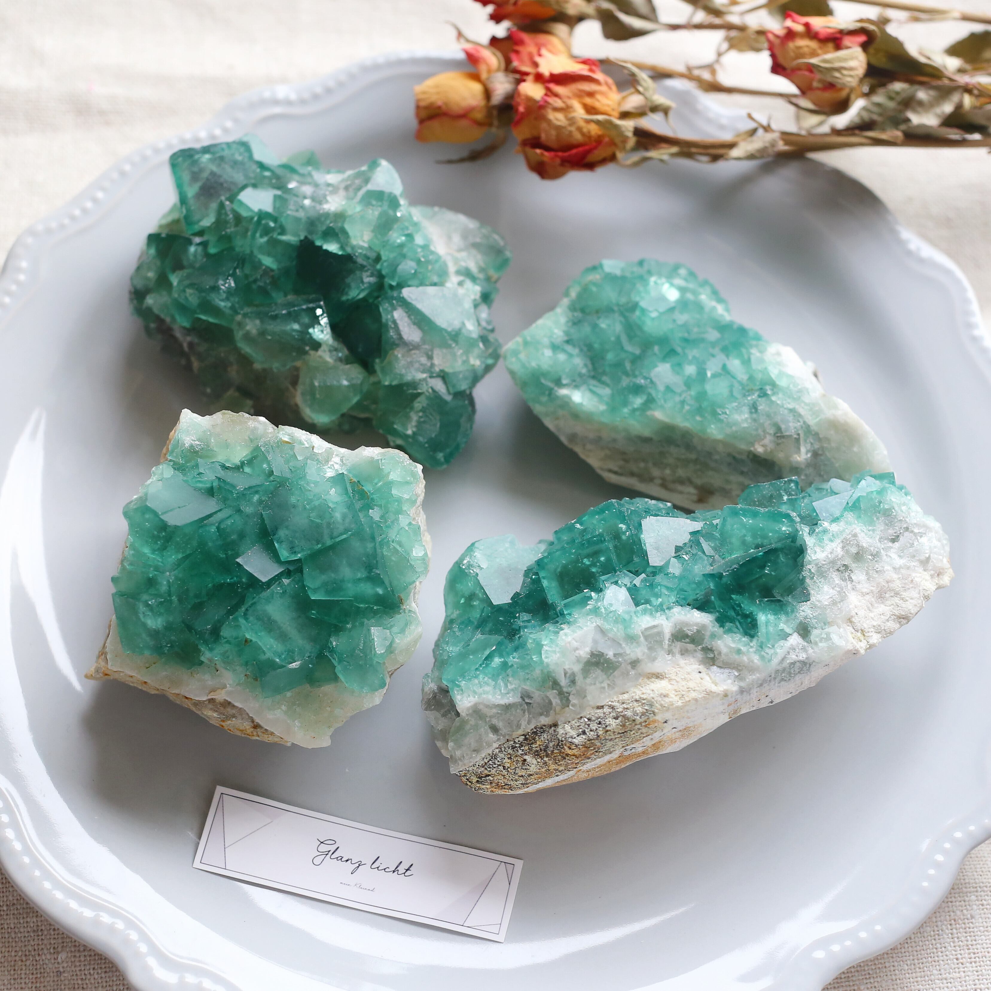お写真だと、ブルーグリーンの色味に見えますが、実物はもう少し緑色です(通常画像の色味変更などはしていませんが、茶色のトレイに乗せている画像のみ実物に近くなるように少し補正しております、ご確認くださいませ)